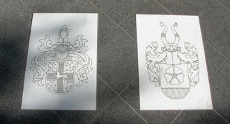 Familienwappen wasserstrahlgeschnitten aus Feinsteinzeug Carrara-Marmor-Nachbildung.